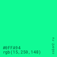 Цвет #0FFA94 в цветовой модели RGB обозначается тремя октетами (15, 250, 148) в десятичном формате и #0FFA94 в шестнадцатиричном (hex) формате, которые являются интенсивностью красного 15 (hex 0F), интенсивность зелёного 250 (hex FA) и интенсивность синего 148 (hex 94).