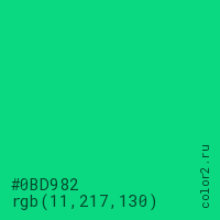 Цвет #0BD982 в цветовой модели RGB обозначается тремя октетами (11, 217, 130) в десятичном формате и #0BD982 в шестнадцатиричном (hex) формате, которые являются интенсивностью красного 11 (hex 0B), интенсивность зелёного 217 (hex D9) и интенсивность синего 130 (hex 82).
