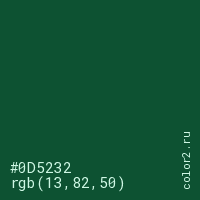Цвет #0D5232 в цветовой модели RGB обозначается тремя октетами (13, 82, 50) в десятичном формате и #0D5232 в шестнадцатиричном (hex) формате, которые являются интенсивностью красного 13 (hex 0D), интенсивность зелёного 82 (hex 52) и интенсивность синего 50 (hex 32).