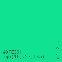 Цвет #0FE391 в цветовой модели RGB обозначается тремя октетами (15, 227, 145) в десятичном формате и #0FE391 в шестнадцатиричном (hex) формате, которые являются интенсивностью красного 15 (hex 0F), интенсивность зелёного 227 (hex E3) и интенсивность синего 145 (hex 91).