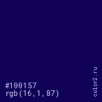 Цвет #100157 в цветовой модели RGB обозначается тремя октетами (16, 1, 87) в десятичном формате и #100157 в шестнадцатиричном (hex) формате, которые являются интенсивностью красного 16 (hex 10), интенсивность зелёного 1 (hex 01) и интенсивность синего 87 (hex 57).