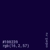 Цвет #100239 в цветовой модели RGB обозначается тремя октетами (16, 2, 57) в десятичном формате и #100239 в шестнадцатиричном (hex) формате, которые являются интенсивностью красного 16 (hex 10), интенсивность зелёного 2 (hex 02) и интенсивность синего 57 (hex 39).