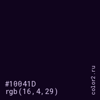 Цвет #10041D в цветовой модели RGB обозначается тремя октетами (16, 4, 29) в десятичном формате и #10041D в шестнадцатиричном (hex) формате, которые являются интенсивностью красного 16 (hex 10), интенсивность зелёного 4 (hex 04) и интенсивность синего 29 (hex 1D).