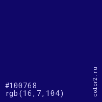 Цвет #100768 в цветовой модели RGB обозначается тремя октетами (16, 7, 104) в десятичном формате и #100768 в шестнадцатиричном (hex) формате, которые являются интенсивностью красного 16 (hex 10), интенсивность зелёного 7 (hex 07) и интенсивность синего 104 (hex 68).