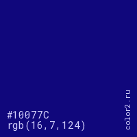 Цвет #10077C в цветовой модели RGB обозначается тремя октетами (16, 7, 124) в десятичном формате и #10077C в шестнадцатиричном (hex) формате, которые являются интенсивностью красного 16 (hex 10), интенсивность зелёного 7 (hex 07) и интенсивность синего 124 (hex 7C).