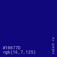 Цвет #10077D в цветовой модели RGB обозначается тремя октетами (16, 7, 125) в десятичном формате и #10077D в шестнадцатиричном (hex) формате, которые являются интенсивностью красного 16 (hex 10), интенсивность зелёного 7 (hex 07) и интенсивность синего 125 (hex 7D).