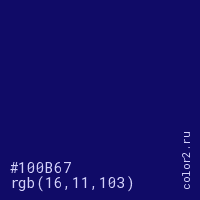 Цвет #100B67 в цветовой модели RGB обозначается тремя октетами (16, 11, 103) в десятичном формате и #100B67 в шестнадцатиричном (hex) формате, которые являются интенсивностью красного 16 (hex 10), интенсивность зелёного 11 (hex 0B) и интенсивность синего 103 (hex 67).