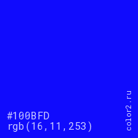 Цвет #100BFD в цветовой модели RGB обозначается тремя октетами (16, 11, 253) в десятичном формате и #100BFD в шестнадцатиричном (hex) формате, которые являются интенсивностью красного 16 (hex 10), интенсивность зелёного 11 (hex 0B) и интенсивность синего 253 (hex FD).