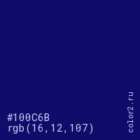 Цвет #100C6B в цветовой модели RGB обозначается тремя октетами (16, 12, 107) в десятичном формате и #100C6B в шестнадцатиричном (hex) формате, которые являются интенсивностью красного 16 (hex 10), интенсивность зелёного 12 (hex 0C) и интенсивность синего 107 (hex 6B).