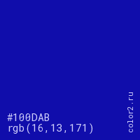 Цвет #100DAB в цветовой модели RGB обозначается тремя октетами (16, 13, 171) в десятичном формате и #100DAB в шестнадцатиричном (hex) формате, которые являются интенсивностью красного 16 (hex 10), интенсивность зелёного 13 (hex 0D) и интенсивность синего 171 (hex AB).