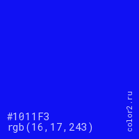Цвет #1011F3 в цветовой модели RGB обозначается тремя октетами (16, 17, 243) в десятичном формате и #1011F3 в шестнадцатиричном (hex) формате, которые являются интенсивностью красного 16 (hex 10), интенсивность зелёного 17 (hex 11) и интенсивность синего 243 (hex F3).