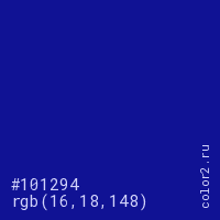 Цвет #101294 в цветовой модели RGB обозначается тремя октетами (16, 18, 148) в десятичном формате и #101294 в шестнадцатиричном (hex) формате, которые являются интенсивностью красного 16 (hex 10), интенсивность зелёного 18 (hex 12) и интенсивность синего 148 (hex 94).