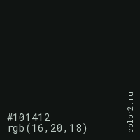 Цвет #101412 в цветовой модели RGB обозначается тремя октетами (16, 20, 18) в десятичном формате и #101412 в шестнадцатиричном (hex) формате, которые являются интенсивностью красного 16 (hex 10), интенсивность зелёного 20 (hex 14) и интенсивность синего 18 (hex 12).