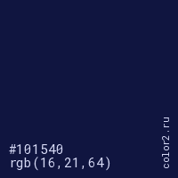 Цвет #101540 в цветовой модели RGB обозначается тремя октетами (16, 21, 64) в десятичном формате и #101540 в шестнадцатиричном (hex) формате, которые являются интенсивностью красного 16 (hex 10), интенсивность зелёного 21 (hex 15) и интенсивность синего 64 (hex 40).