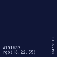 Цвет #101637 в цветовой модели RGB обозначается тремя октетами (16, 22, 55) в десятичном формате и #101637 в шестнадцатиричном (hex) формате, которые являются интенсивностью красного 16 (hex 10), интенсивность зелёного 22 (hex 16) и интенсивность синего 55 (hex 37).