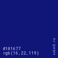 Цвет #101677 в цветовой модели RGB обозначается тремя октетами (16, 22, 119) в десятичном формате и #101677 в шестнадцатиричном (hex) формате, которые являются интенсивностью красного 16 (hex 10), интенсивность зелёного 22 (hex 16) и интенсивность синего 119 (hex 77).