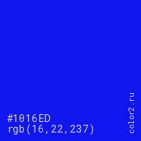Цвет #1016ED в цветовой модели RGB обозначается тремя октетами (16, 22, 237) в десятичном формате и #1016ED в шестнадцатиричном (hex) формате, которые являются интенсивностью красного 16 (hex 10), интенсивность зелёного 22 (hex 16) и интенсивность синего 237 (hex ED).