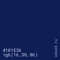 Цвет #101E56 в цветовой модели RGB обозначается тремя октетами (16, 30, 86) в десятичном формате и #101E56 в шестнадцатиричном (hex) формате, которые являются интенсивностью красного 16 (hex 10), интенсивность зелёного 30 (hex 1E) и интенсивность синего 86 (hex 56).