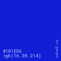 Цвет #101ED6 в цветовой модели RGB обозначается тремя октетами (16, 30, 214) в десятичном формате и #101ED6 в шестнадцатиричном (hex) формате, которые являются интенсивностью красного 16 (hex 10), интенсивность зелёного 30 (hex 1E) и интенсивность синего 214 (hex D6).
