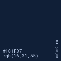 Цвет #101F37 в цветовой модели RGB обозначается тремя октетами (16, 31, 55) в десятичном формате и #101F37 в шестнадцатиричном (hex) формате, которые являются интенсивностью красного 16 (hex 10), интенсивность зелёного 31 (hex 1F) и интенсивность синего 55 (hex 37).