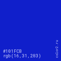 Цвет #101FCB в цветовой модели RGB обозначается тремя октетами (16, 31, 203) в десятичном формате и #101FCB в шестнадцатиричном (hex) формате, которые являются интенсивностью красного 16 (hex 10), интенсивность зелёного 31 (hex 1F) и интенсивность синего 203 (hex CB).