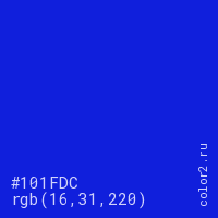 Цвет #101FDC в цветовой модели RGB обозначается тремя октетами (16, 31, 220) в десятичном формате и #101FDC в шестнадцатиричном (hex) формате, которые являются интенсивностью красного 16 (hex 10), интенсивность зелёного 31 (hex 1F) и интенсивность синего 220 (hex DC).