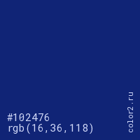 Цвет #102476 в цветовой модели RGB обозначается тремя октетами (16, 36, 118) в десятичном формате и #102476 в шестнадцатиричном (hex) формате, которые являются интенсивностью красного 16 (hex 10), интенсивность зелёного 36 (hex 24) и интенсивность синего 118 (hex 76).