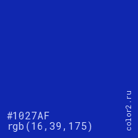 Цвет #1027AF в цветовой модели RGB обозначается тремя октетами (16, 39, 175) в десятичном формате и #1027AF в шестнадцатиричном (hex) формате, которые являются интенсивностью красного 16 (hex 10), интенсивность зелёного 39 (hex 27) и интенсивность синего 175 (hex AF).