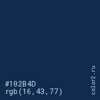 Цвет #102B4D в цветовой модели RGB обозначается тремя октетами (16, 43, 77) в десятичном формате и #102B4D в шестнадцатиричном (hex) формате, которые являются интенсивностью красного 16 (hex 10), интенсивность зелёного 43 (hex 2B) и интенсивность синего 77 (hex 4D).