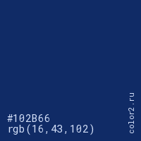 Цвет #102B66 в цветовой модели RGB обозначается тремя октетами (16, 43, 102) в десятичном формате и #102B66 в шестнадцатиричном (hex) формате, которые являются интенсивностью красного 16 (hex 10), интенсивность зелёного 43 (hex 2B) и интенсивность синего 102 (hex 66).