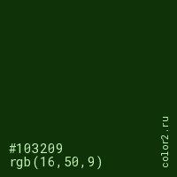 Цвет #103209 в цветовой модели RGB обозначается тремя октетами (16, 50, 9) в десятичном формате и #103209 в шестнадцатиричном (hex) формате, которые являются интенсивностью красного 16 (hex 10), интенсивность зелёного 50 (hex 32) и интенсивность синего 9 (hex 09).