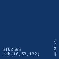 Цвет #103566 в цветовой модели RGB обозначается тремя октетами (16, 53, 102) в десятичном формате и #103566 в шестнадцатиричном (hex) формате, которые являются интенсивностью красного 16 (hex 10), интенсивность зелёного 53 (hex 35) и интенсивность синего 102 (hex 66).