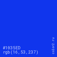 Цвет #1035ED в цветовой модели RGB обозначается тремя октетами (16, 53, 237) в десятичном формате и #1035ED в шестнадцатиричном (hex) формате, которые являются интенсивностью красного 16 (hex 10), интенсивность зелёного 53 (hex 35) и интенсивность синего 237 (hex ED).