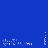Цвет #1037C7 в цветовой модели RGB обозначается тремя октетами (16, 55, 199) в десятичном формате и #1037C7 в шестнадцатиричном (hex) формате, которые являются интенсивностью красного 16 (hex 10), интенсивность зелёного 55 (hex 37) и интенсивность синего 199 (hex C7).