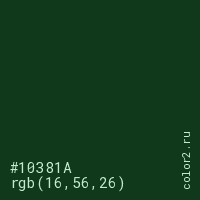 Цвет #10381A в цветовой модели RGB обозначается тремя октетами (16, 56, 26) в десятичном формате и #10381A в шестнадцатиричном (hex) формате, которые являются интенсивностью красного 16 (hex 10), интенсивность зелёного 56 (hex 38) и интенсивность синего 26 (hex 1A).