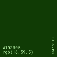 Цвет #103B05 в цветовой модели RGB обозначается тремя октетами (16, 59, 5) в десятичном формате и #103B05 в шестнадцатиричном (hex) формате, которые являются интенсивностью красного 16 (hex 10), интенсивность зелёного 59 (hex 3B) и интенсивность синего 5 (hex 05).