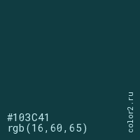 Цвет #103C41 в цветовой модели RGB обозначается тремя октетами (16, 60, 65) в десятичном формате и #103C41 в шестнадцатиричном (hex) формате, которые являются интенсивностью красного 16 (hex 10), интенсивность зелёного 60 (hex 3C) и интенсивность синего 65 (hex 41).
