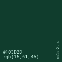 Цвет #103D2D в цветовой модели RGB обозначается тремя октетами (16, 61, 45) в десятичном формате и #103D2D в шестнадцатиричном (hex) формате, которые являются интенсивностью красного 16 (hex 10), интенсивность зелёного 61 (hex 3D) и интенсивность синего 45 (hex 2D).
