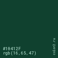 Цвет #10412F в цветовой модели RGB обозначается тремя октетами (16, 65, 47) в десятичном формате и #10412F в шестнадцатиричном (hex) формате, которые являются интенсивностью красного 16 (hex 10), интенсивность зелёного 65 (hex 41) и интенсивность синего 47 (hex 2F).