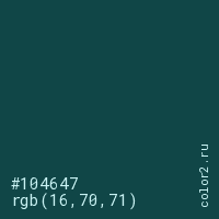 Цвет #104647 в цветовой модели RGB обозначается тремя октетами (16, 70, 71) в десятичном формате и #104647 в шестнадцатиричном (hex) формате, которые являются интенсивностью красного 16 (hex 10), интенсивность зелёного 70 (hex 46) и интенсивность синего 71 (hex 47).