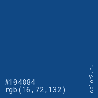 Цвет #104884 в цветовой модели RGB обозначается тремя октетами (16, 72, 132) в десятичном формате и #104884 в шестнадцатиричном (hex) формате, которые являются интенсивностью красного 16 (hex 10), интенсивность зелёного 72 (hex 48) и интенсивность синего 132 (hex 84).