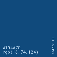 Цвет #104A7C в цветовой модели RGB обозначается тремя октетами (16, 74, 124) в десятичном формате и #104A7C в шестнадцатиричном (hex) формате, которые являются интенсивностью красного 16 (hex 10), интенсивность зелёного 74 (hex 4A) и интенсивность синего 124 (hex 7C).