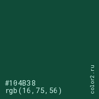 Цвет #104B38 в цветовой модели RGB обозначается тремя октетами (16, 75, 56) в десятичном формате и #104B38 в шестнадцатиричном (hex) формате, которые являются интенсивностью красного 16 (hex 10), интенсивность зелёного 75 (hex 4B) и интенсивность синего 56 (hex 38).