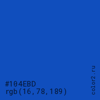 Цвет #104EBD в цветовой модели RGB обозначается тремя октетами (16, 78, 189) в десятичном формате и #104EBD в шестнадцатиричном (hex) формате, которые являются интенсивностью красного 16 (hex 10), интенсивность зелёного 78 (hex 4E) и интенсивность синего 189 (hex BD).