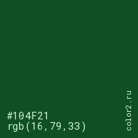 Цвет #104F21 в цветовой модели RGB обозначается тремя октетами (16, 79, 33) в десятичном формате и #104F21 в шестнадцатиричном (hex) формате, которые являются интенсивностью красного 16 (hex 10), интенсивность зелёного 79 (hex 4F) и интенсивность синего 33 (hex 21).