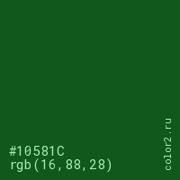 Цвет #10581C в цветовой модели RGB обозначается тремя октетами (16, 88, 28) в десятичном формате и #10581C в шестнадцатиричном (hex) формате, которые являются интенсивностью красного 16 (hex 10), интенсивность зелёного 88 (hex 58) и интенсивность синего 28 (hex 1C).