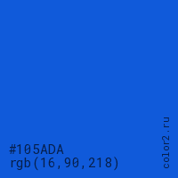 Цвет #105ADA в цветовой модели RGB обозначается тремя октетами (16, 90, 218) в десятичном формате и #105ADA в шестнадцатиричном (hex) формате, которые являются интенсивностью красного 16 (hex 10), интенсивность зелёного 90 (hex 5A) и интенсивность синего 218 (hex DA).