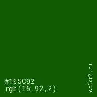 Цвет #105C02 в цветовой модели RGB обозначается тремя октетами (16, 92, 2) в десятичном формате и #105C02 в шестнадцатиричном (hex) формате, которые являются интенсивностью красного 16 (hex 10), интенсивность зелёного 92 (hex 5C) и интенсивность синего 2 (hex 02).