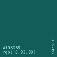 Цвет #105D59 в цветовой модели RGB обозначается тремя октетами (16, 93, 89) в десятичном формате и #105D59 в шестнадцатиричном (hex) формате, которые являются интенсивностью красного 16 (hex 10), интенсивность зелёного 93 (hex 5D) и интенсивность синего 89 (hex 59).