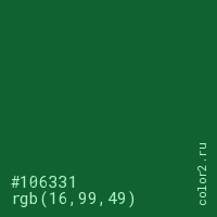 Цвет #106331 в цветовой модели RGB обозначается тремя октетами (16, 99, 49) в десятичном формате и #106331 в шестнадцатиричном (hex) формате, которые являются интенсивностью красного 16 (hex 10), интенсивность зелёного 99 (hex 63) и интенсивность синего 49 (hex 31).